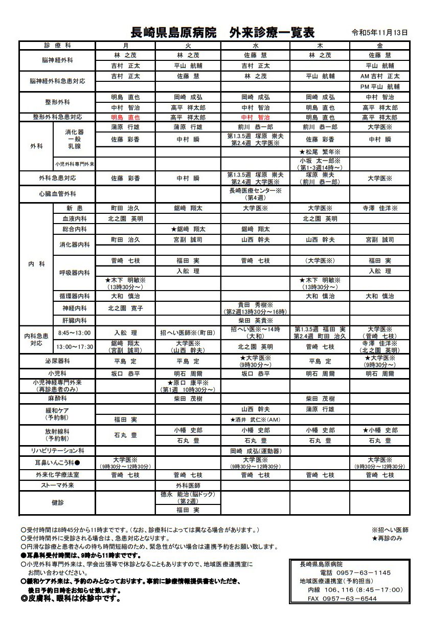 外来診療一覧表